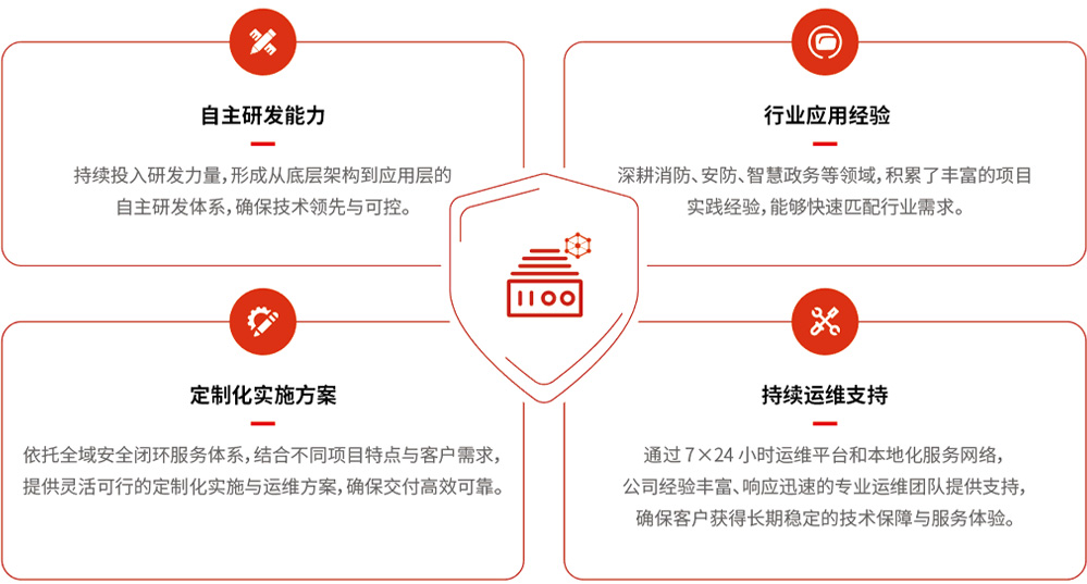 公司以构建"共建、共治、共享"的安全生态为目标,面向政府机构、企事业单位及社会公众,持续提供可信赖的产品与服务。我们希望通过专业技术与责任精神,成为客户长期信任的合作伙伴,助力行业智能化、安全化升级,共同打造安全、稳定、智慧的社会环境。