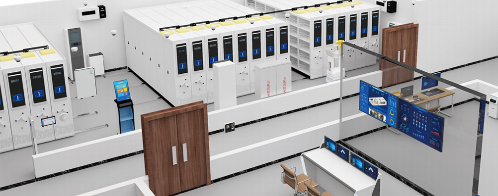 支持智慧档案大数据展示功能:可接入拼接大屏的实时数据传输与监控管理,库房鸟瞰图、档案库状分析图、库存档案总量、在库数、在借数、异常数、档案消毒量分析、温湿度空气质量展示、温湿度空气质量数据分析、报警、环境设备运行状态、视频实时监控等功能。