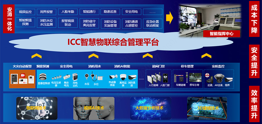 安防消防系统的融合应用,打破信息孤岛,通过技防手段升级,提升防范效率以减少人力投入;通过前端传感器结合、消安统一平台、火灾安防数据联动,提升了消防管理效率。
